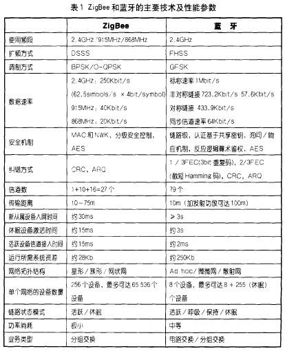 为更直观地比较ZigBee和蓝牙,下面将两种技术的主要技术及性能参数列表,如表1所示。