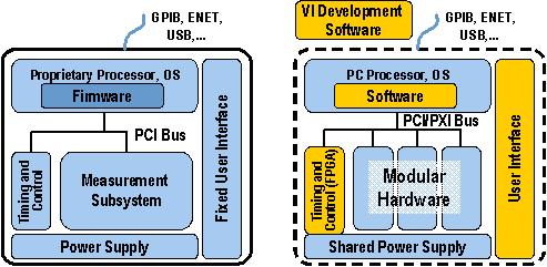 图5.传统仪器(左图)和基于软件的虚拟仪器(右图)具有许多相同的结构组件,但是在体系结构原理上完全不同