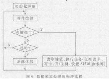 应用程序用MAIL 命令方式完成电子标签卡的读写。该进程首先初始化屏幕, 然后等待按键中断, 当有键按下时, 根据键值执行相应的工作; 当指定时间内没有键按下, 系统则进入休眠状态, 从而达到省电的目的。程序流程图如图6。
