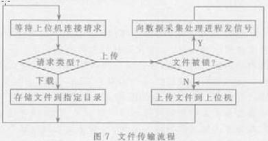 Linux 是多任务系统, 支持多线程及多进程。多线程的优点是线程比进程小, 可以使应用更轻便, 线程间通信方便; 缺点是所有线程使用同一个地址空间, 如果一个线程出现问题, 整个系统将受影响; 而进程各自占有一份内存空间, 可以增强系统的稳定性, 但是多进程增加了系统开销, 进程间通信复杂。为此, 根据实际情况,考虑到系统稳定性, 本系统采取两者相结合的方式分别完成数据采集处理及文件传输功能。