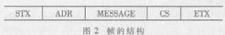 ConfiTalk 协议是一种面向字符的应答式串行通信协议。它每次传输一定长度的数据块( 帧) , 每个帧包含帧头(STX)和帧尾(ETX)。为了提高数据传输的可靠性,每帧又加入了8 位的校验位(CS)及地址位(ADR)。帧的结构如图2。