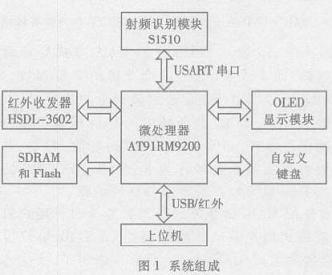 系统采用Atmel 公司的AT91RM9200 32 位高性能处理器、TagMaster 公司的S1510 及OLED 显示模块等实现电子标签卡信息的采集、处理、实时显示及与上位机通信等功能。系统组成如图1。