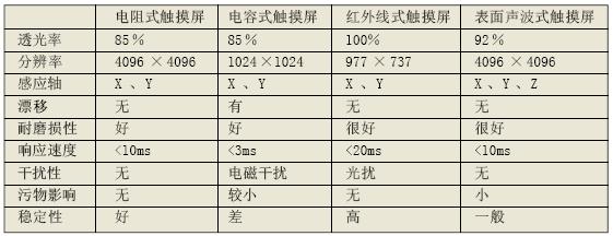 各种触摸屏都是依靠传感器来工作的,甚至有的触摸屏本身就是一套传感器。它们各自的定位原理和各自所用的传感器决定了触摸屏的反应速度、可靠性、稳定性和寿命。各类触摸屏的技术特性如表1 所示。
