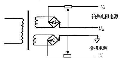 由于铂热电阻接在三导线单臂电桥,铂热电阻的单臂电桥需要电源供电,供电电压UA = 5V。采用计算机进行测量,又需要提供微机整机电源。这样需要提供两套电源。为了提高测量温度精度,减少对测温电路的干扰,这两套电源采用相互独立的电源供电,电路如图。UA = 5V为铂热电阻电源,U为微机电源。