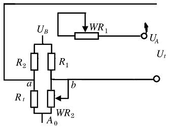 图中电桥供电电压UA = 5V。为了保证电压精度,采用WR2 =Ω来调节电桥电源电压UB ,使UB = 4V,WRt 为150Ω的滑线电阻,其目的在于保证电桥电路中当t = 0℃时,Ut = 0V,Ao为电桥独立接地点。