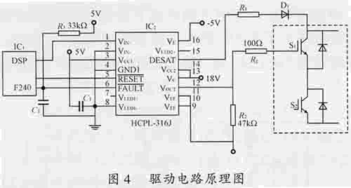 目前,各公司推出的用于IGBT驱动的电路各具特色。HP公司的HCPL-316J集成了VCE欠饱和检测及故障状态反馈电路,为驱动电路的可靠工作提供了保障,同时还具有简单易实现的特点。图4给出了基于DSPF240的IGBT驱动方案原理图。