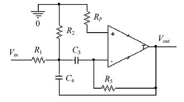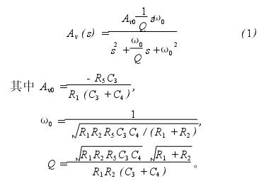 一般RC 无源滤波电路传递函数幅度小, 带负载能力差。而由集成运放和R、C 元件组成的RC有源滤波电路具有传递增益, 带负载能力强,有利于改善电路滤波特性。本文采用一种有源滤波器:二阶无限增益多路反馈带通滤波。其模型如图7所示, 二阶RC 网络接于运放的反相输入端。这种负反馈联接,使集成运放工作于线性状态,有利于避免电路自激。其传递函数如式( 1 )所示。该带通滤波的中心频率设置为455kHz, 3 dB带宽为80 kHz。