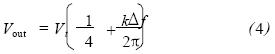 上述线性相移特性关系使得Vt与乘法器经低通滤波器的输出Vout之间成比例关系, 比例系数与频偏Δf有关,如式4所示。