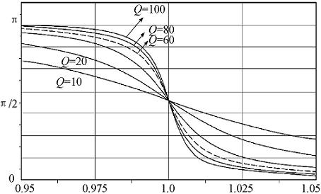 移相器的相频特性如图9所示,横坐标为归一化的频率[1 + Δf/f1], 当信号没有发生偏移时的相移为π/2。从图9 中可见, 该相频特性曲线在坐标点(1,π/2)附近存在一段线性关系,可以推导得出相移大小与频偏之间的近似线性关系Φ =π/2- kΔf。移相器的Q值对线性斜率有显著影响。当Q 值较大时,线性斜率比较大,相移对频偏的反应比较灵敏。