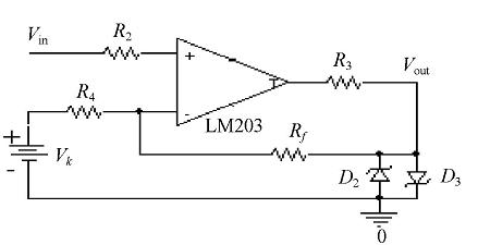 本文采用滞回电压比较电路进行电平门限判决, 见图10。把模拟电压信号转换成数字信号。这种电路由于存在回差电压ΔVREF , 当输入信号电压受到干扰时, 只要在基准电压电平附近的干扰电压不超过回差电压时, 则不会导致电路输出状态的跳变, 仍可获得比较稳定的输出电压波形。可见, 滞回比较电路的抗干扰能力强, 但灵敏度有所下降。