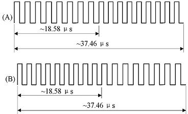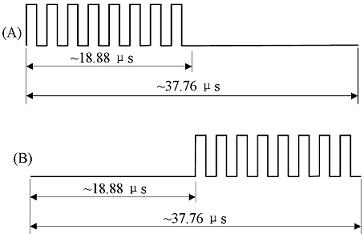 使用双副载波的位编码。逻辑0开始于8个fs1 的脉冲,随后是9个fs2 的脉冲,见图3 (A)。逻辑1开始于9个fs1 的脉冲,随后是8个fs2 的脉冲,见图3 (B)。