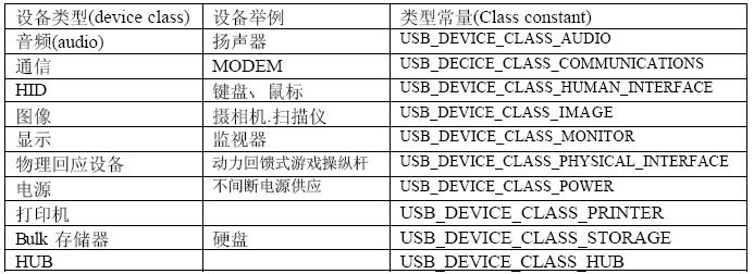 虽然USB 设备都会表现USB 的一些基本的特征,但是USB 的设备还是可以分成多个不同类型,同类型的设备可以拥有一些共同的行为特征和工作协议.从而使设备的驱动程序的书写变得简单一些.下表中就给出一些基本的USB的设备类型分类: