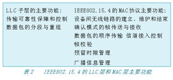 IEEE802.15.4 的MAC层能支持多种LLC标准,通过SSCS(Service-Specific Convergence Sublayer,业务相关的会聚子层)协议承载IEEE802.2类型一的LLC标准,同时允许其他LLC标准直接使用IEEE802.15.4 的MAC层服务。表2列出了IEEE802.15.4的LLC层和MAC层主要功能: