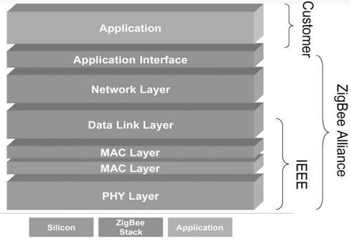 在标准制定的分工上,由ZigBee Alliance与IEEE 802.15.4的任务小组共同制定,其中实体层、MAC层、资料链结层,以及传输过程中的资料加密机制等发展由IEEE所主导,并共同针对ZigBee Protocol Stack的发展进行研讨,而未来还能依系统客户的需求,为不同应用修正其所需之应用介面(如图二所示):