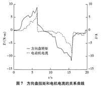 根据电动转向控制系统对稳定性和跟踪性的需要,采用最优H二控制器编制电动转向系统控制程序,并在汽车电动转向试验台上进行台架模拟试验,车速信号用模拟车速传感器发出的脉冲信号代替网。图7为中等车速转向助力时,测量的方向盘转矩(T)和助力电动机电流(I)变化曲线。从图7中可以看出,在转向过程中,助力电动机电流随着方向盘转矩的变化而变化,电动机电流的变化趋势和方向盘转矩的变化趋势相吻合,表明电动机的助力转矩对方向盘转矩有良好的跟踪性能。转向操作时,无助力滞后感,转向平稳,表明转向系统具有良好的跟踪性能和操纵稳定性。
