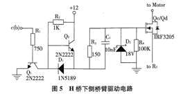 当MOSFET的控制信号c(d)低电平时, Q1截止,Q2导通,电源通过Q2以及R3与C,组成的并联电路对Qc的栅极充电,直至Qc完全导通。当Qc导通时,其栅—源极电压等于电源电压减去Q2的集—射极饱和导通电压,而电源电压又等于蓄电池电压减去1N5819二极管的正向导通电压。所以,Qc的栅—源极电压VGS=(Vbat-VCE-VF),当蓄电池电压为12V,取各参数为典型值得Qc的栅-源极电压为11.26V,满足IRF3205的栅极驱动(10V)所需的电压。