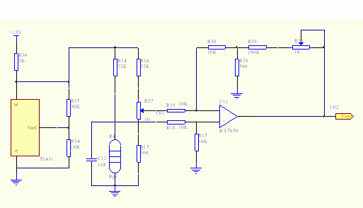 我们使用电桥读取铂电阻的输出信号,图中TL431电路部分为供桥电压产生电路,因为供桥电源的变化几乎是一比一的反映到电桥电压输出,所以供桥电源的稳定与否直接影响到温度采样的精度。当系统有一精度足够的+10V电源时,TL431电路部分可以省略。电桥部分桥上臂电阻选22KΩ,右下臂电阻选100Ω,电桥输出电压为: