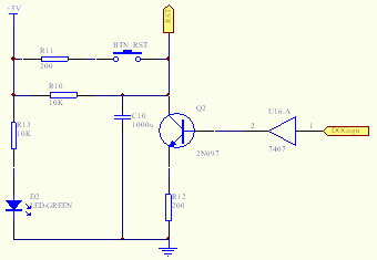 电容C1通过“Q2 R3 地”放电。这样我们通过在程序运行中定时对P1.7脚进行置位和清零操作,便可以保持Q2集电极为低电平。当程序进入死循还,不能对P1.7口进行置位操作,那么电路就会对电容持续充电,使Q2集电极电平持续上升,当上升到高电平电压时,单片机系统复位,程序重新开始运行,达到看门狗功能。电阻R1与电容C1值应根据程序运行情况选择,R1越大,充电电流越小,电平上升时间就越长,反之则反。R4和D1起电源指示作用,R2和按钮构成手动复位电路。