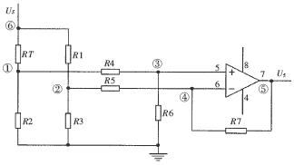 由于桥路的要求,R3=R2,R4~R7的阻值比较大,这里可以忽略它们的影响来计算节点①和②之间的电压差(U12)的变化范围,从而求出R6、R7的阻值(R4阻值乘以放大倍数K)。 - 计算RT取最大值和最小值时该电路的分辨率。