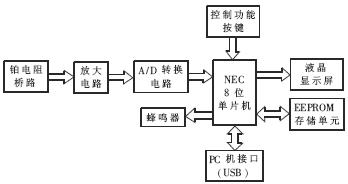 测温仪的系统硬件结构框图如图1所示。考虑到功耗及整机的精度和价格等问题,测温仪的单片机控制器采用NEC的8位78K0系列单片机,并启用了看门狗功能,以提高测温仪的抗干扰性能。测温系统采用不平衡电桥测量铂电阻随温度变化的电压信号,经过放大、A/D转换后,送到单片机中进行处理和显示。采集时显示最值温度,超过设定值则报警。本测温仪通过USB接口与PC机连接,上位机负责设置采集开始时间、采集间隔时间等参数,并读取下位机数据,进行数据分析和处理。