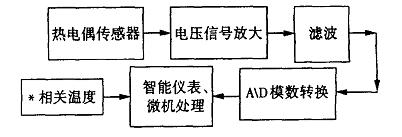 现在的温度采集、控制系统可以将采集到的电偶电压经过放大、滤波、A/ D 变换成数字信号,并用下位单片机把它经过串行通信总线RS485、电平转换芯片MAX232、RS232 串行总线送给上位计算机, 从而实现测量、控制作用。也可使用智能控制仪表(含IC 微处理器) 来实现显示和控制, 具体的流程如图2 所示。