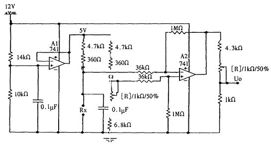 UP 和UQ 分别为差动放大器的两个输入电压,其中UP = RX ER / ( RC + Rx ) , UQ = RB ER( RA + RB ) ,RF = 1MΩ , RI = 36KΩ。当RI 远大于桥路的四个臂电阻RA , RB , RC 和RX 时, 输出电压可以简化成: