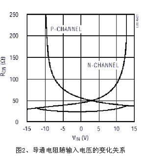 1、导通电阻:传统模拟开关的结构如图1 所示,它由N 沟道MOSFET 与P 沟道MOSFET 并联构成,可使信号双向传输,如果将不同VIN值所对应的P 沟道MOSFET 与N 沟道MOSFET 的导通电阻并联,可得到图2 并联结构下导通电阻(RON)随输入电压(VIN)的变化关系,如果不考虑温度、电源电压的影响,RON 随VIN 呈线性关系,将导致插入损耗的变化,使模拟开关产生总谐波失真(THD),这是设计人员所不希望的,如何将RON随VIN的变化量降至最小也是设计新一代模拟开关所面临的一个关键问题。