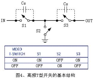 T 型开关适用于视频及其它频率高于10MHz的应用,如图4 所示,它由两个模拟开关(S1、S3)串联组成,另一开关S2 接在地和S1、S3