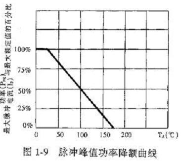 典型的脉冲持续时间tp为1MS,当施加到瞬态电压抑制二极管上的脉冲时间tp 比标准脉冲时间短时,其脉冲峰值功率将随tp的缩短而增加。图1-8给出了PPR与tp 的关系曲线。TVS的反向脉冲峰值功率PPR与经受浪涌的脉冲波形有关,用功率系数K1表示,各种浪涌波形的K1值如表1所示。