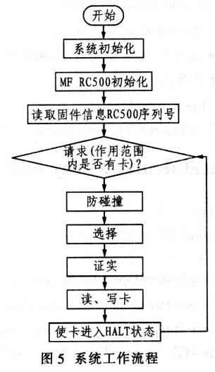当对应的RFlD卡S50进入阅读器的有效范围时,天线的能量使RFID卡耦合出自身工作的能量,并建立通信。MF RC500对卡的操作主要是通过写通讯命令、参数和数据到FIFODATA,再通过写命令到120MMAND,实现与RFID卡的通讯。系统工作流程如图 5所示。