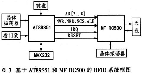 根据RFID原理和MF RC500的特性,可设计基于AT89S51和MF RC500的REID阅读器系统,其结构框图如图3所示。