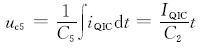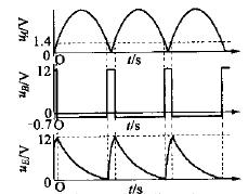 调速器的同步信号、脉冲形成、放大与输出电路由运算放大器U1D、U1A及外围元件组成。取自全波整流桥D1~D4的输出电压uA,作为同步信号经D6、D7限幅输入U1D的反相输入端,经B点输出矩形波,该矩形波经Q1、R6对C5充电,此电路的实质是恒流源(Q1、R6)对C5充电,当Q1导通期间,恒流源电路IQ1C对C5恒流充电,电容两端的电压为: