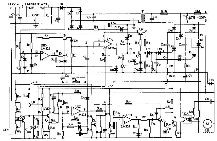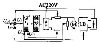 D20~D23组成单相桥式半控整流电路,由D16、D17、D20、D21组成励磁电源,LM324集成电路四个运算放大器U1A、U1B、U1C、U1D分别完成触发脉冲形成、放大,控制电压合成,触发脉冲封锁,电压负反馈调节,电流正反馈调节,励磁电源失磁保护等功能。调速器电路原理图如图2所示。
