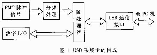 该采集系统由笔者自行开发并用于单光子计数种子活性快速检测仪中。它主要由将光子信号转为电信号的光电倍增管(PMT)及其辅助电路和基于AN2131Q的 USB采集卡组成。PMT及其前置放大器、放大器、甄别器等辅助电路能将微弱的光子信号转换为15ns的标准TTL脉冲信号,脉冲信号经过分频处理后再被 USB采集,USB将采集的结果实时地传给主机处理。