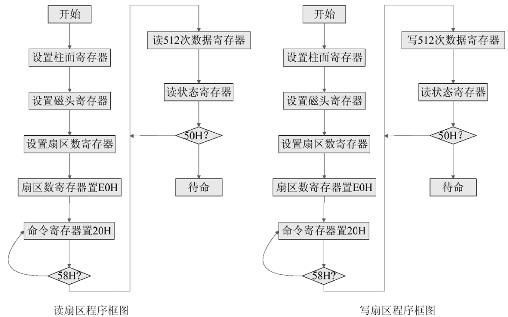 严格遵循ATA标准的CF卡设备对软件的编制有非常标准化的方法,而且基于CFA的协议,CF卡硬件上的向下兼容性也保证了软件设计上的兼容性。CF卡工作在内存映射下的读写程序逻辑框图如图3所示。值得指出的是,不同于一般的Flash存储器,CF卡采用IDE标准的读写方式,它的寻址方式、读写方式,甚至命令都与普通的ATA硬盘相符合。也就是说,CF是在模拟硬盘的读写,按照扇区、磁道、柱面来寻址。同硬盘一样,CF卡不能够对位操作,它的一次性吞吐量为一个扇区,也就是512个字节。CF卡在设计之初,之所以要采取类似硬盘的读写方式,是因为这种方法的存储速度快、可靠,并能节省资源。本设计并不需要在CF上面建立文件系统,这样可以充分利用CF卡存储量大、速度快的特点,同时也可使软件的编制更为简化。