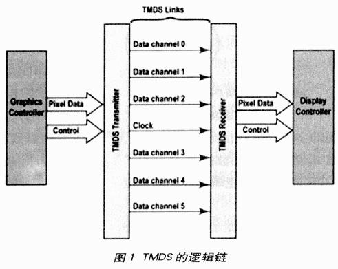 如图1所示,DVI允许两个TMDS链,每一链由三路数据通道组成,用于传送RGB信息,最大带宽为165MHz,相当于每秒165M个像素。