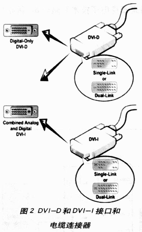 图2所示的是DVI-D和DVI-I插座,位于PC的背面。来自数字平板显示器的DVI-D接口的插谷地有12针或24针(单链DVI-I插头只用其中的12针或24针)DVI-I接口可接受12针或24针DVI插头,或者一种新型的模拟插头,这种模拟插头带有4个附加的针及一个接地平面,以维持模拟RGB信号恒定的阻抗。