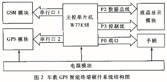 主控单片机采用具有两个串口的高性能单片机W77E58。在系统中,主控单片机负责接收用户的手柄输入信号和GPS输入信号;对GPS信号进行计算,以获得当前的经、纬度坐标;接收并解析ITS中心发送的短消息命令,按命令进行上传定位坐标、报警等操作;另外还负责把系统的运行状态及ITS的信息通过液晶屏显示出来。