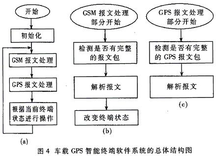 车载GPS 智能终端软件系统的主要功能是由主程序完成的。主程序采用状态机的系统结构,其总体结构图如图4所示。其中,(a)为总体流程框图,(b)为GSM报文处理部分流程图,(c)为GPS报文处理部分流程图。终端可以处于8种状态:空闲、上传定位信息、定时上传定位信息、拨号、通话中、网络无法连通、GPS无法定位、报警。状态间的切换主要由ITS中心通过发送消息的命令报文控制。