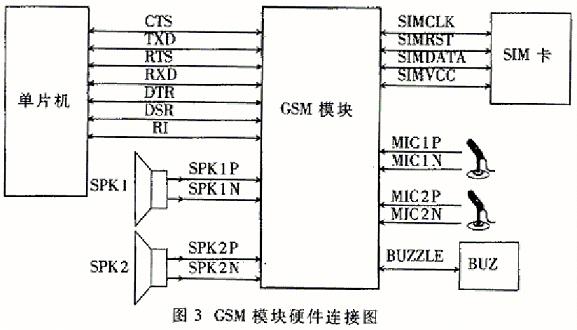使用GSM模块可以方便地利用GSM网进行通讯。它同主控制器以串行口的方式连接,并采用一定的波特率进行通信。主控制器可以通过AT命令控制GSM模块使其发送短消息,使用GPRS传送数据或进行语音通话。GSM模块硬件连接图如图3所示。