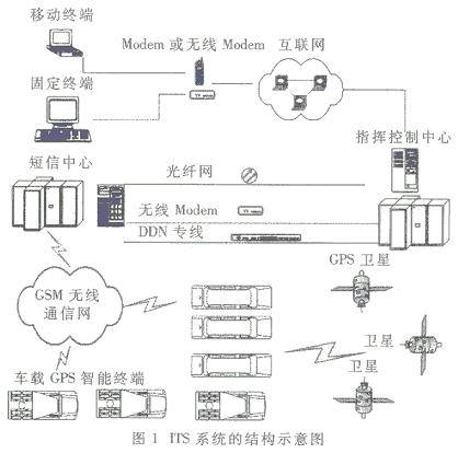 如何把定位信息发送给ITS 中心一直是比较难解决的问题之一。以往的ITS系统多采用集群通信系统实现车载终端与ITS中心的通讯。但是这种系统具有覆盖区域小、安装维护费用高、技术复杂等缺点。近两年随着GSM/GPRS网在中国的普及,车载终端通过GSM/GPRS网与ITS中心通讯的方式已经成为最受欢迎的方式。这主要由于以下原因:(1)GSM/GPRS网覆盖面广,目前已经遍及我国大部分地区,包括乡村和边远地区;(2)无需建网、维护;(3)GSM/GPRS网可靠性高、误码率低;(4)使用短消息功能或GPRS进行数据传输,费用比较低;(5)由于GSM/GPRS技术使用广泛,提供相应通讯模块的厂商较多,价格也比较合理。这里设计的ITS系统就是基于GPS卫星系统和GSM/GPRS这两大系统的。其结构如图1所示。