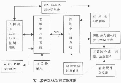 采用MCU设计,以软件代替硬件,电路板的面积和功耗明显的小了,这样对系统可靠性无疑是有好处的。同时,由于现代的MCU的程序存储器均有加密技术,可以防止非法拷贝,保护知识产权。另外,如果UPS的软件系统设计相对完善,其故障自检功能较强,则可以为安装维护人员提供方便,节省费用和工时。以下为针对在线式智能UPS的几个设计方案。