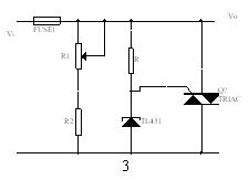 3:过电压保护电路(附图3)当Vi超过一定电压时,TL431触发,使晶闸管导通,产生瞬间大电流,将保险丝熔断,从而保护后极电路。V保护点=(1+R1/R2)Vref.