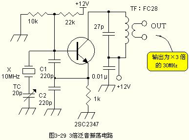 (此为利用无调整电路的高谐波成分,在输出的谐振电路取出3倍频的30MHz信号。)