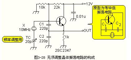 图28所示的为无调整晶体振荡电路。其原型为考毕兹振荡电路。