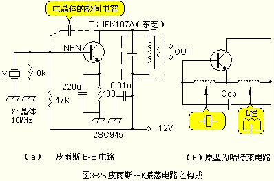 图26的电路称为皮尔斯B-E电路。其原型为图(b)的哈特莱振荡电路。哈特莱振荡电路的电容器为利用晶体管的集极-基极间电容量Cab。