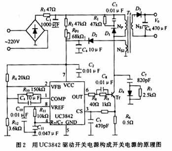 图2为芯片UC3842、桥式整流电路、高频变压器以及大功率晶体管构成的电流控制型脉宽调制开关稳压电源,这种新型的控制方式使得开关电源同时具有很高的电压调整率和负载调整率。