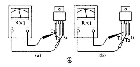 (2)把黑表笔接T1极,红表笔接T2极,电阻为无穷大。接着用红表笔尖把T2与G短路,给G极加上负触发信号,电阻值应为十欧左右(参见图4 (a)),证明管子已经导通,导通方向为T1一T2。再将红表笔尖与G极脱开(但仍接T2),若电阻值保持不变,证明管子在触发之后能维持导通状态(见图 4(b))。