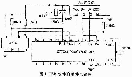 本文设计的USB软件狗的硬件电路图如图1所示。其核心器件是微控制器(可根据需要选用CY7C63100A或CY7C63101A,其区别为程序存储器的空间不同,分别为2K字节和4K字节)和串行EEPROM(24C02),各元件的具体参数如图1所示。