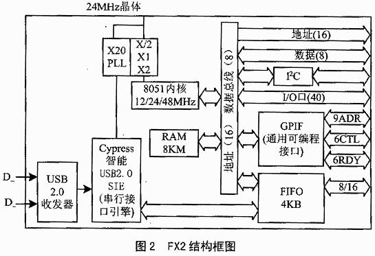 EZ-USB FX2芯片包括1个8051处理器、1个串行接口引擎(SIE)、1个USB收发器、8.5KB片上RAM、4KB FIFO存储器以及1个通用可编程接口(GPIF),如图2所示。FX2是一个全面集成的解决方案,它占用更少的电路板空间,并缩短开发时间。